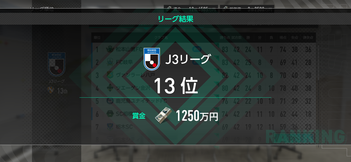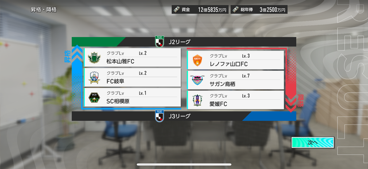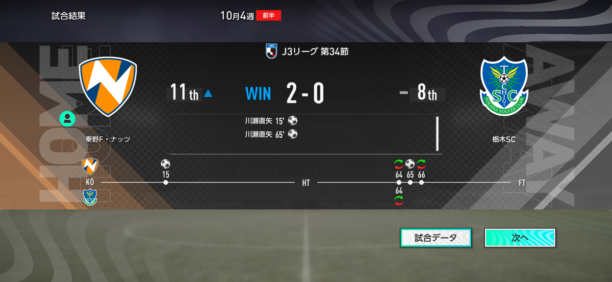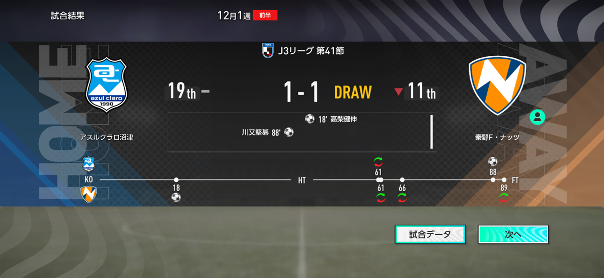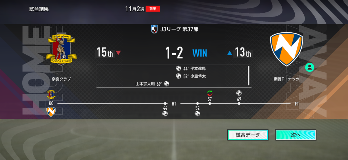 秦野キッズたちの無邪気な発言に奮い立ち、監督Lvが3になったので、色々と強化して迎えたJ3リーグ終盤戦。