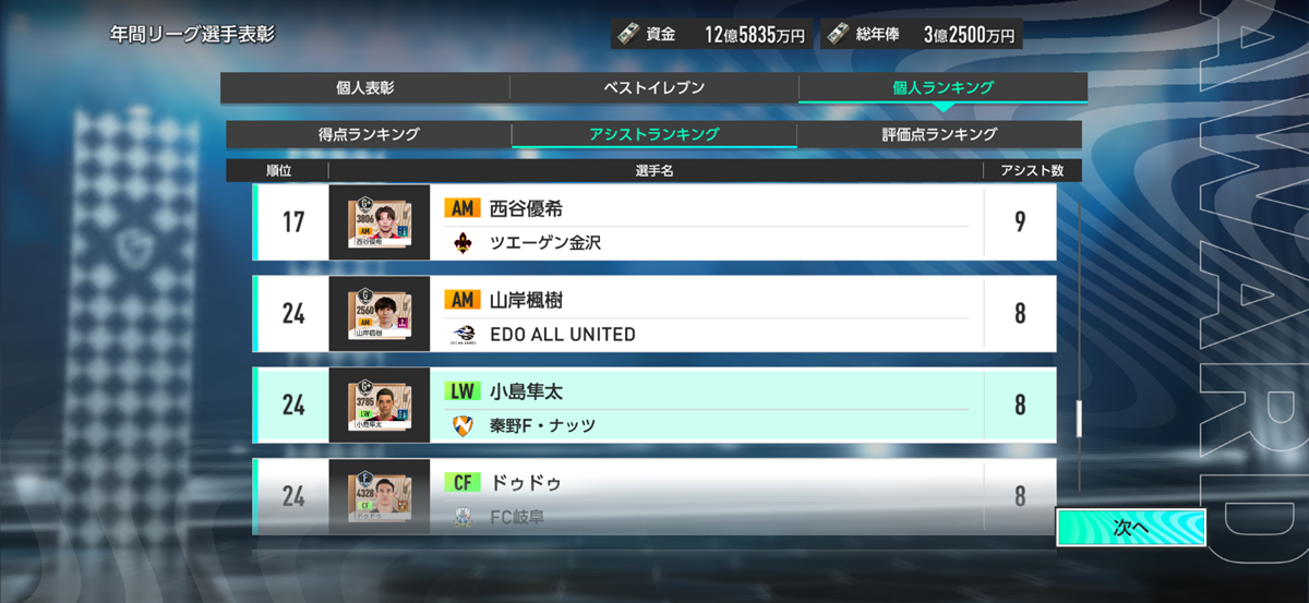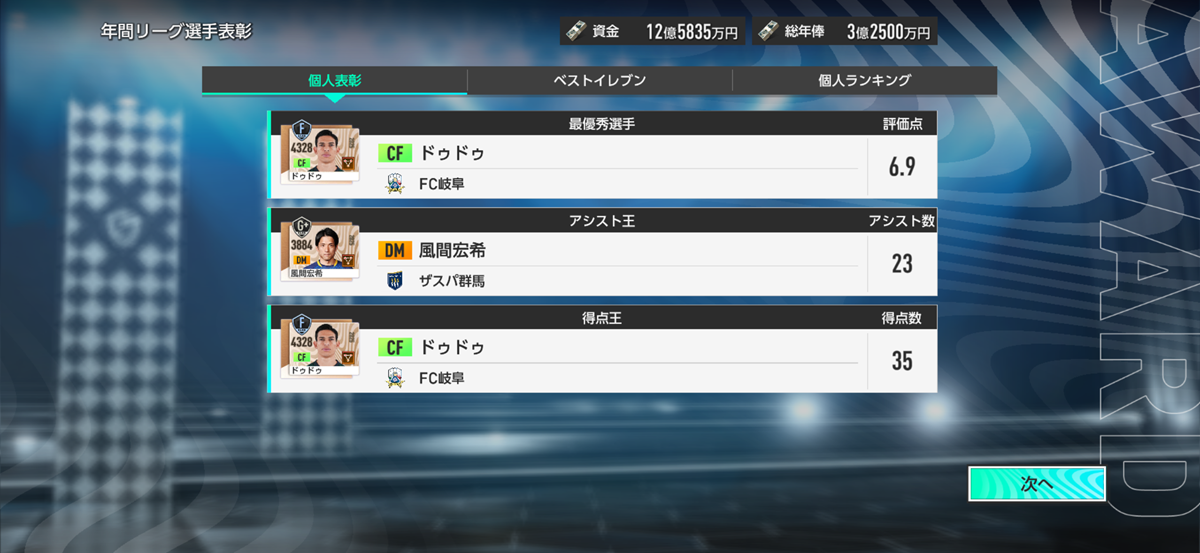 あ~、ちなみにうちの選手は残念ながらベストイレブンや個人ランキング上位にかすりもしなかったよ。