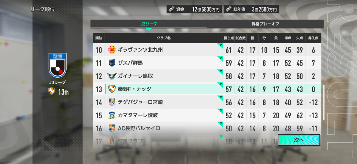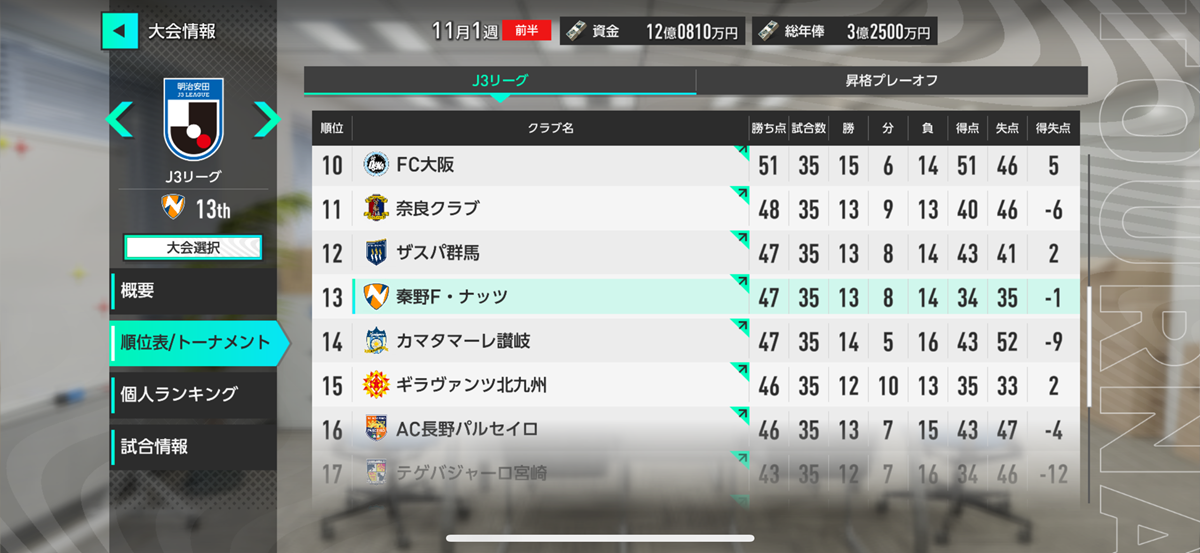 スポンサーミッション10位以上のボーダーラインにいるFC大阪との勝ち点差は4。残り7試合でその差をどこまで縮められるかね。