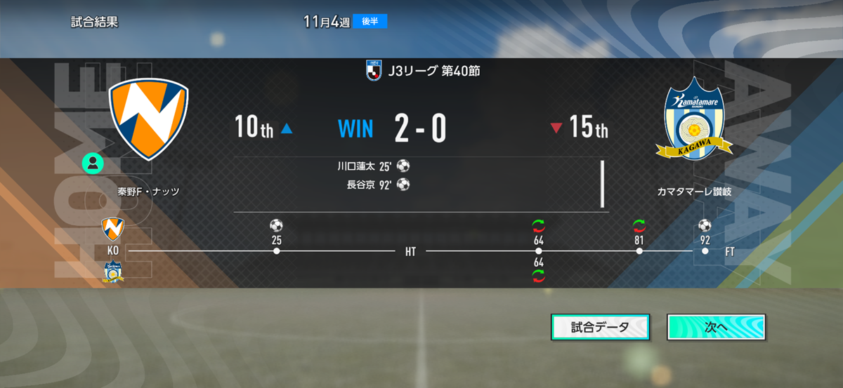 カマタマーレ讃岐に勝ったことで、10位に浮上した。残すところあと2試合。連勝できればリーグ最終順位10位以上が約束される!