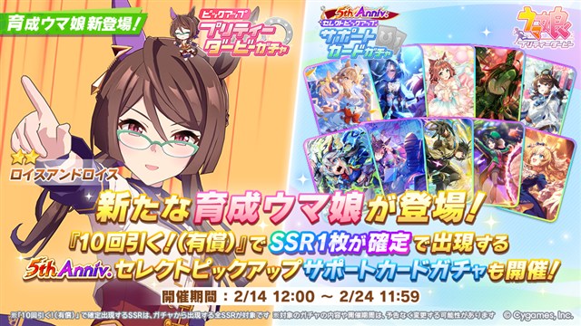 また、Cygamesの『ウマ娘 プリティーダービー』が前日の33位から25位に上昇し、トップ20復帰をうかがう体制となっている。『ウマ娘』は、2月14日12時より、新たな育成ウマ娘「★2 [Inspiring Genius]ロイスアンドロイス」が登場した「ピックアップ プリティーダービーガチャ」と、「5th Anniv.セレクトピックアップ サポートカードガチャ」を開催していることなどが今回の順位上昇につながっているもようだ。