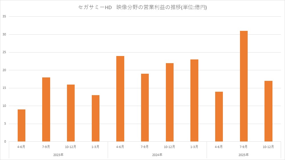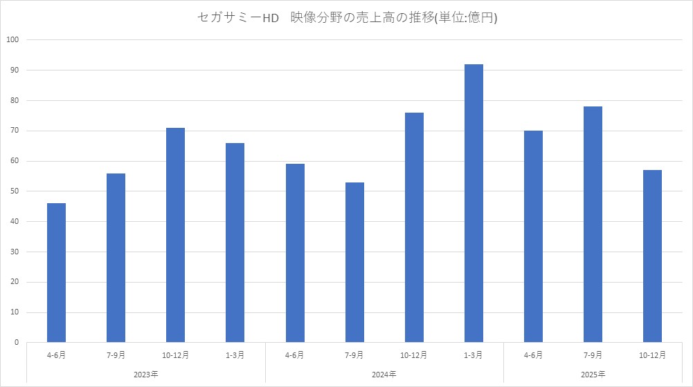 セガサミーホールディングス<6460>は、エンターテインメント事業の「映像」分野の第3四半期決算について、売上高が前年同期比9.0%増の205億円、営業利益が同4.6%減の62億円と増収・減益だったことを明らかにした。