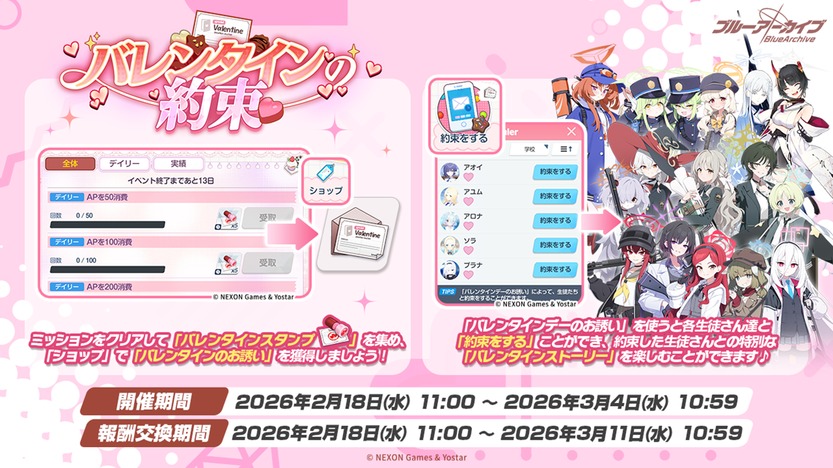 Yostar は、アプリゲーム『ブルーアーカイブ -Blue Archive-』(開発:NEXON Games 社)において、2 月 18 日(水)11:00 より、イベント「ゲーム開発部のお掃除大作戦」、スペシャルイベント「バレンタインの約束」の開催について発表した。