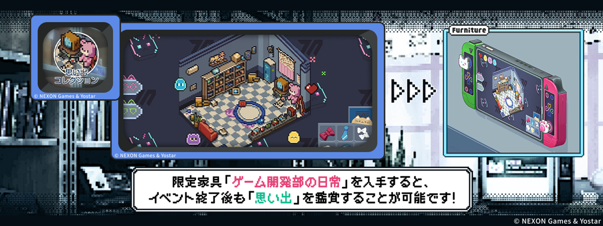 収集した「思い出」はイベント終了後も鑑賞可能で、「カフェ」に限定家具「ゲーム開発部の日常」を設置するといつでも楽しむことができる。