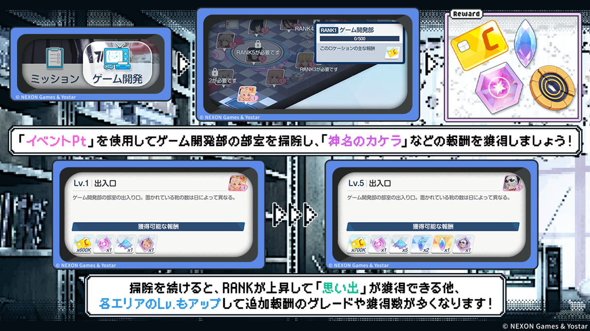 集めた「イベント Pt」は、「ゲーム開発部」で使用して部室をお掃除することで、「神名のカケラ」など報酬のほか、累計獲得数に応じて様々なアイテムも入手できる。また、お掃除を続けて「ゲーム開発部」の部室が RANK アップすると「思い出」が獲得できる他、各エリアの Lv.もアップして追加報酬のグレードや獲得数が多くなる。