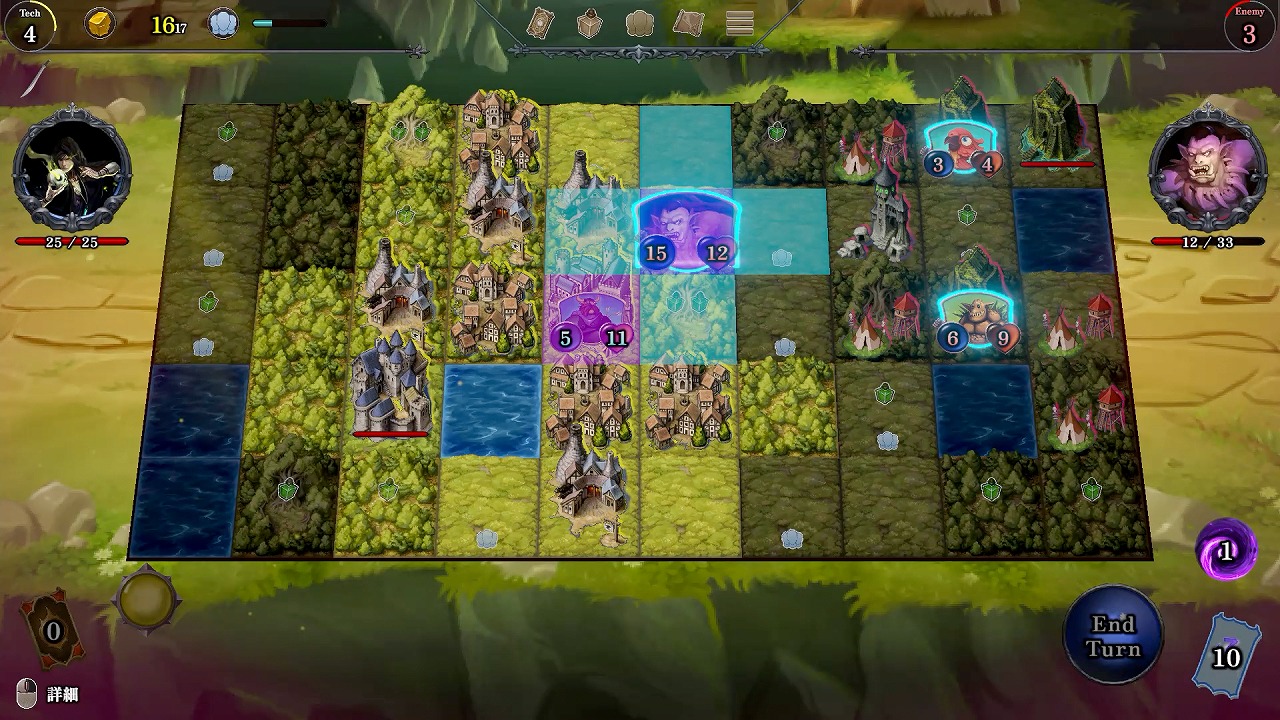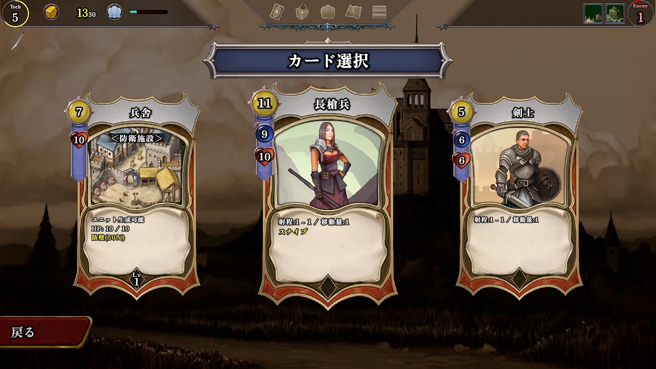 人口ポイントが一定以上になると、カード選択によって新たなカードを獲得できる。ユニットの数値に注目。技術Lvが低いうちはAtk9、Mhp10の長槍兵が主力が……