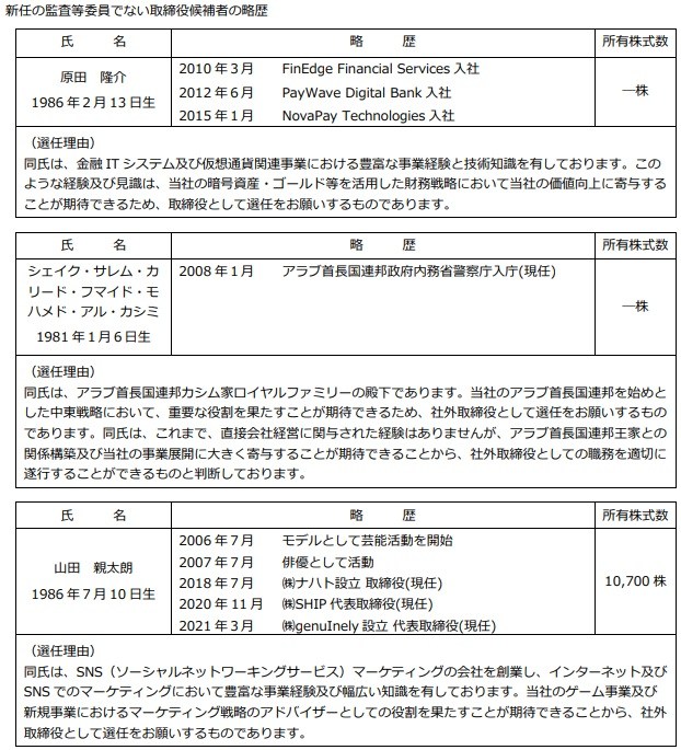 監査等委員でない取締役は、代表取締役社長の真田 哲弥氏など任期満了を迎える4名が重任するとともに、新たに原田 隆介氏が取締役、UAEの王族であるシェイク・サレム・カリード・フマイド・モハメド・アル・カシミ殿下と元モデル・俳優の山田 親太朗氏が社外取締役に就任する。