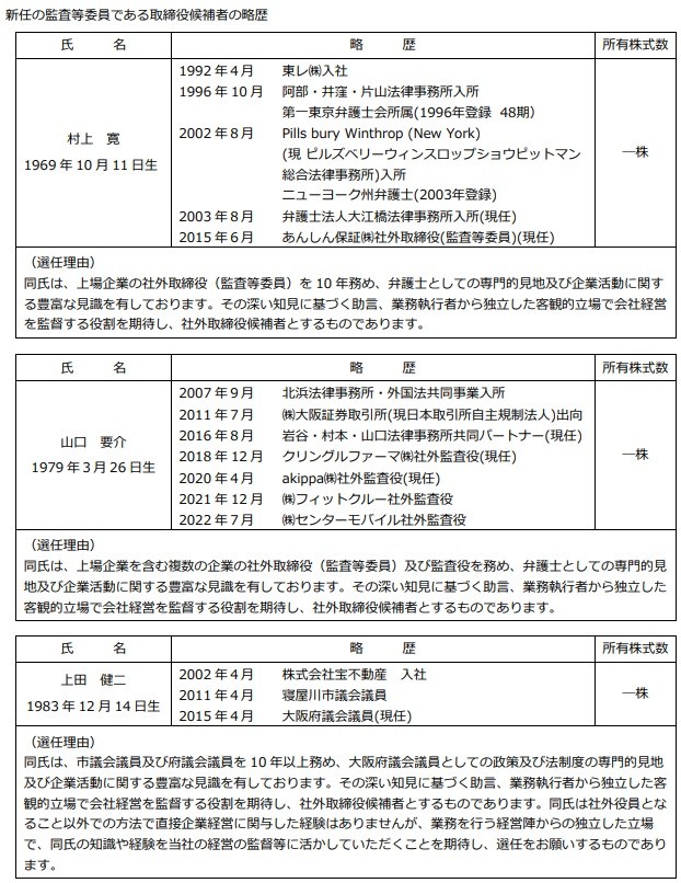 監査等委員である取締役は、任期満了を迎える3名のうち、井上 昌治氏が重任する。また、村上 寛氏と山口 要介氏、上田 健二氏の3名が新たに就任し、監査体制の強化を図るために1名が増員される。