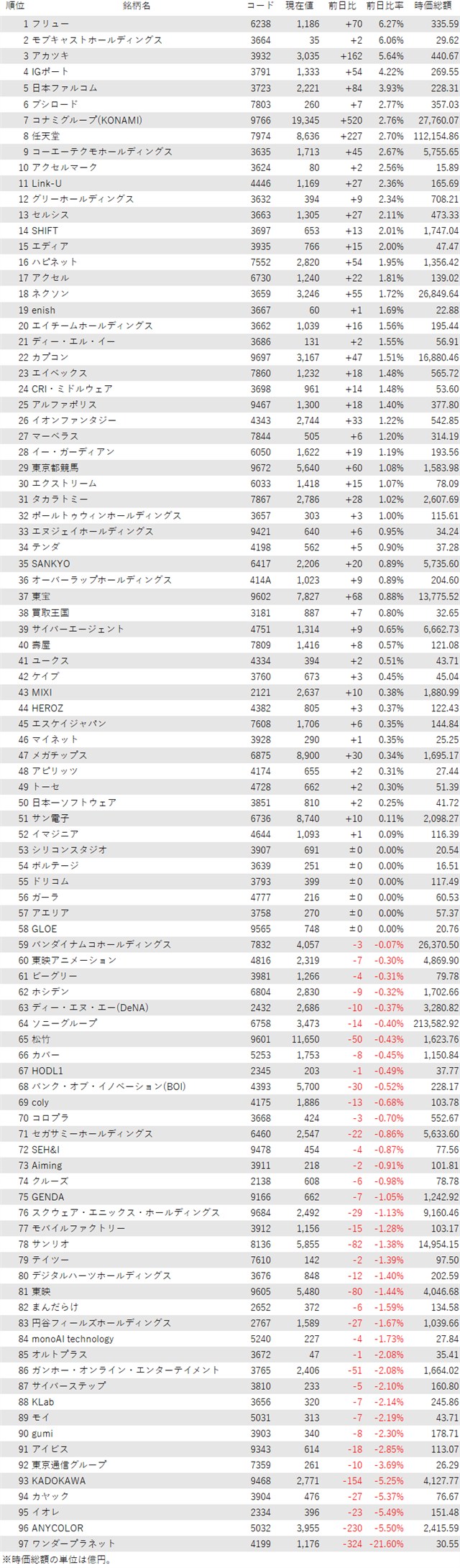 そうした中でゲーム・エンタメ関連株の動きを見てみると、下記の表に登録しているゲーム・エンタメ関連企業97銘柄のうち、上昇は52銘柄(54%)、下落は39銘柄(40%)、変わらずは6銘柄(6%)で、上昇した銘柄のほうが多かった。