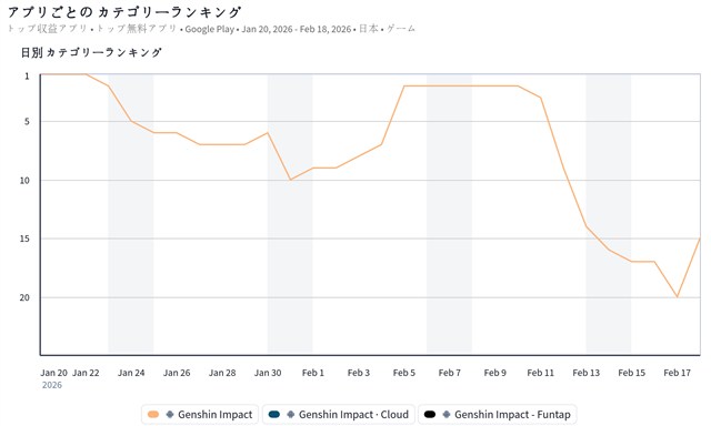 トップ20圏内の動きで目立ったのは、前日の20位から15位に上昇したHoYoverseの『原神』だ。目新しいゲーム内施策は現時点ではないものの、2月25日に新バージョン「Luna Ⅴ」をリリースすることが発表されており、月末にかけてさらに上位をうかがう態勢となってくることが予想される。
