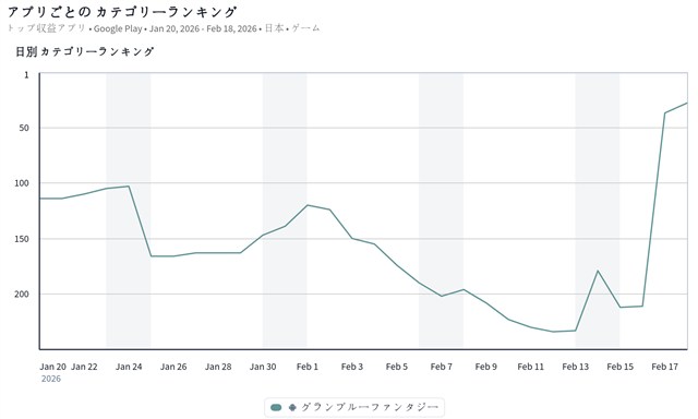 また、Cygamesの『グランブルーファンタジー』が前日の37位から28位へと順位を上げてきた。『グラブル』は、2月14日19時より、「グランデフェス」を開催しており、新キャラクターのバレンタインバージョン「ワムデュス」「ガウェイン」の解放武器が登場していることなどが今回の順位上昇につながっているもようだ。