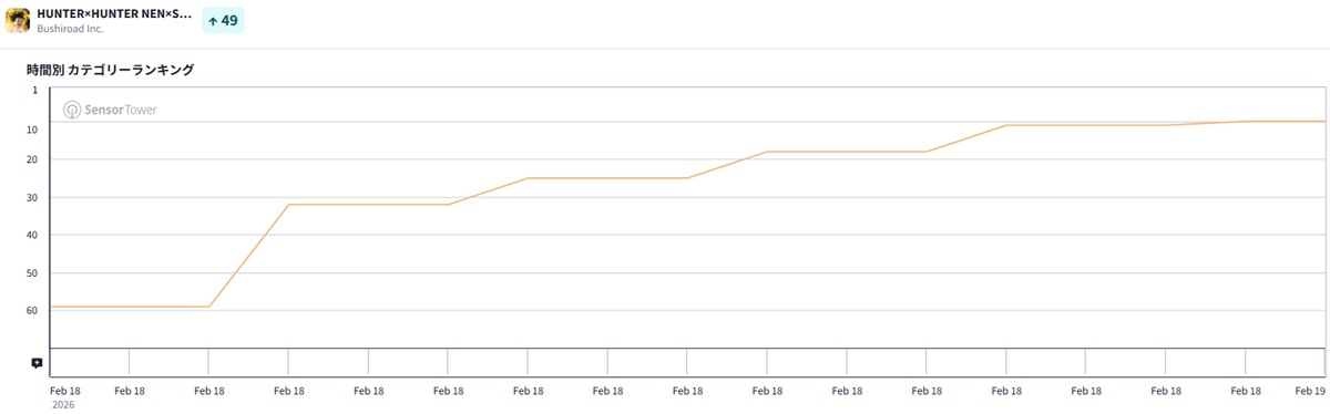 2月18日にリリースされた、ブシロード<7803>とワンダープラネット<4199>の共同開発新作モバイルゲーム『HUNTER×HUNTER NEN×SURVIVOR』が、早速トップ10入りを果たした。