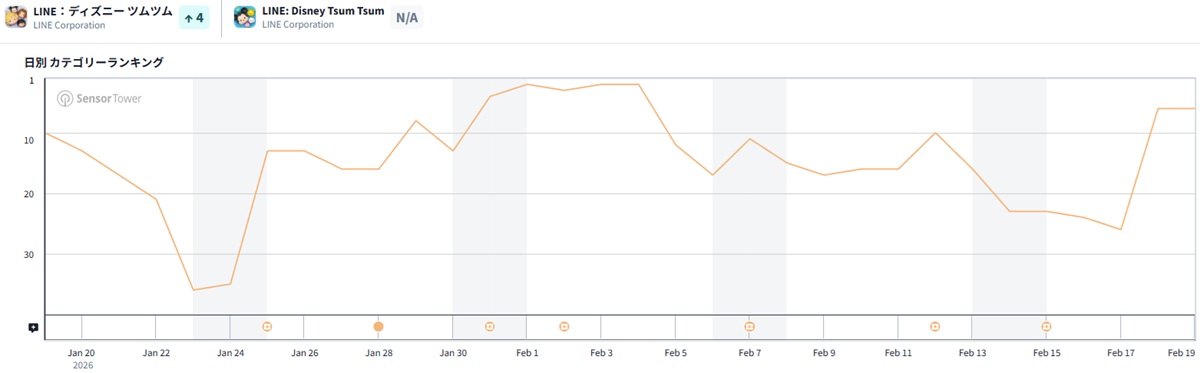 上位陣を見ると、LINEヤフー<4689>とNHN PlayArtの『LINE:ディズニー ツムツム』が、20ランクアップで6位につけている。