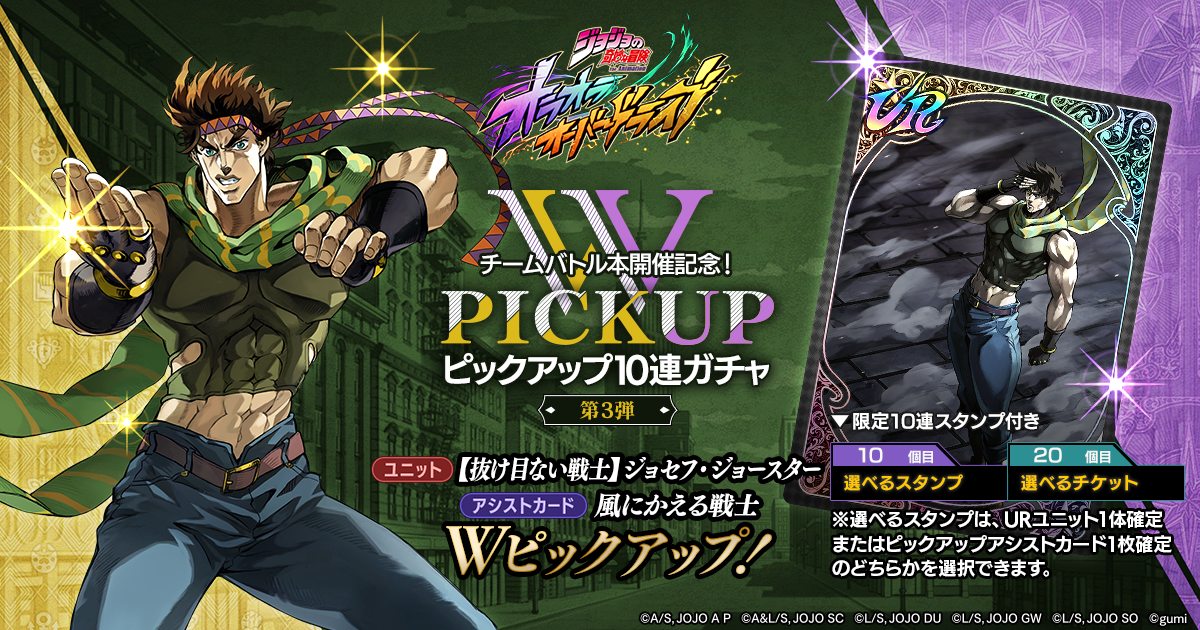 『【抜け目ない戦士】ジョセフ・ジョースター』、『風にかえる戦士』をピックアップしたガチャを開催する。10連ガチャでSR以上が1枠確定で登場。さらに、スタンプ3個目で「虹の覚醒ダイヤ」x1、スタンプ20個目で「選べるピックアップ確定チケット」x1を獲得できる限定10連ガチャスタンプ付き。