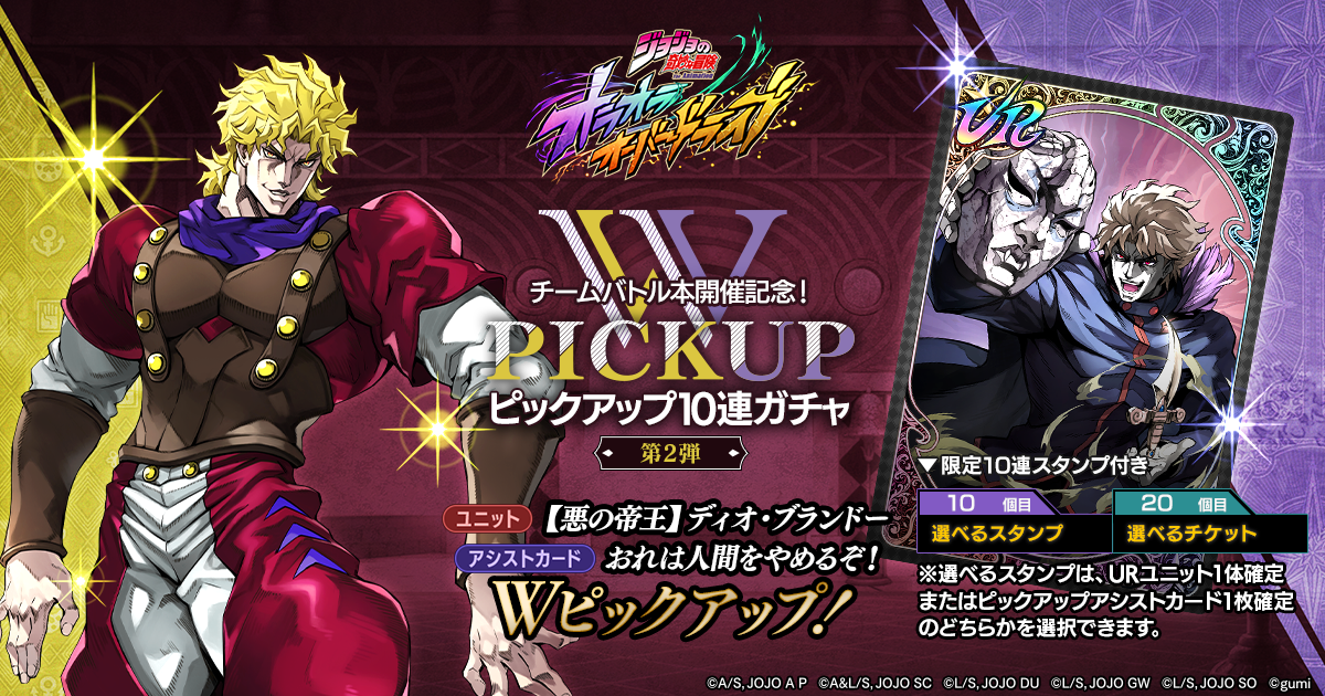 『【悪の帝王】ディオ・ブランドー』、『おれは人間をやめるぞ!』をピックアップしたガチャを開催。10連ガチャでSR以上が1枠確定で登場する。さらに、スタンプ3個目で「虹の覚醒ダイヤ」x1、スタンプ20個目で「選べるピックアップ確定チケット」x1を獲得できる限定10連ガチャスタンプ付きだ。