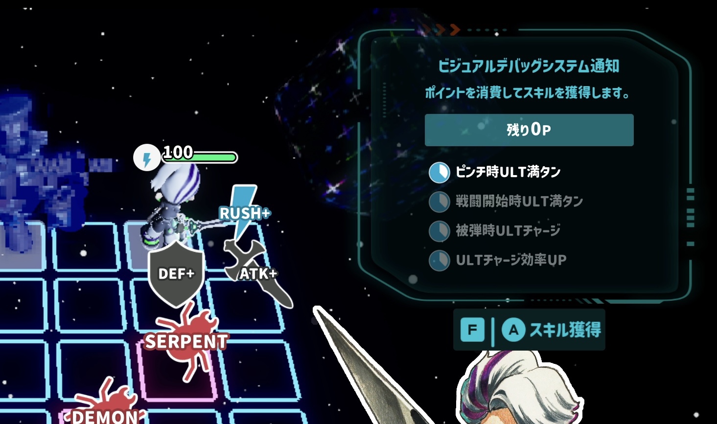 グリッドベースのハイスピードな戦闘が展開される。戦闘中はバグが引き起こすデバフが発生。