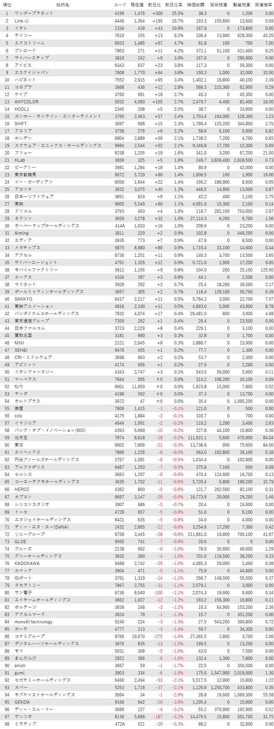 こうしたなか、ゲーム・エンタメ関連企業をみると、登録されている98銘柄のうち、上昇は50銘柄(51%)、下落は44銘柄(45%)、変わらずは4銘柄(4%)で、買い優勢だった。