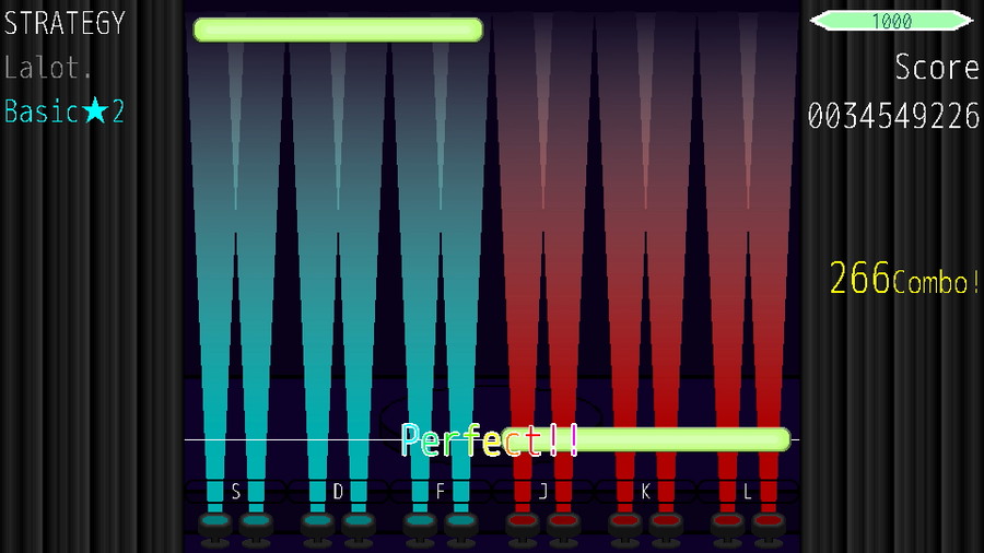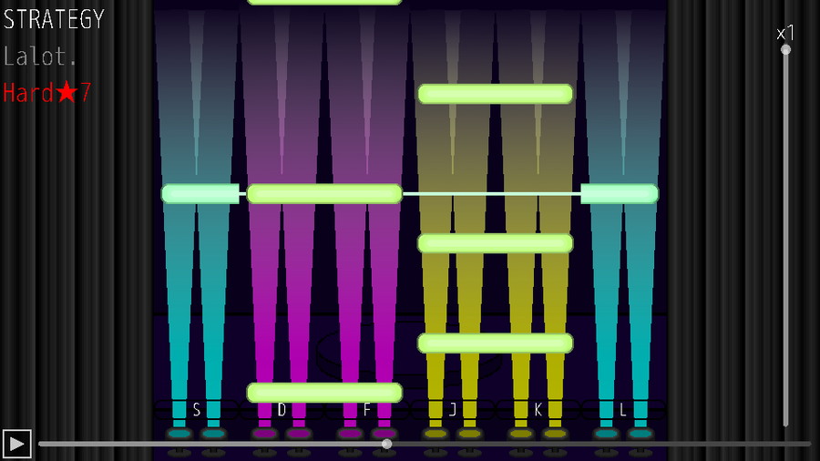 本作は、レーンが自動で切り替わる、簡単かつ難しい音楽ゲームである。一つのノーツを複数のキーで取ることができるため、同じ譜面でも多様な運指でプレイすることが可能だ。