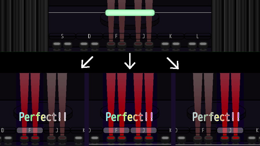 背景にある各キーに対応するスポットライトの光の色によりレーンが切り替わる。複数のキーが同じ色になった場合、その箇所は一つのレーンとして扱われ、対応するいずれのキーでもノーツを取得できる。