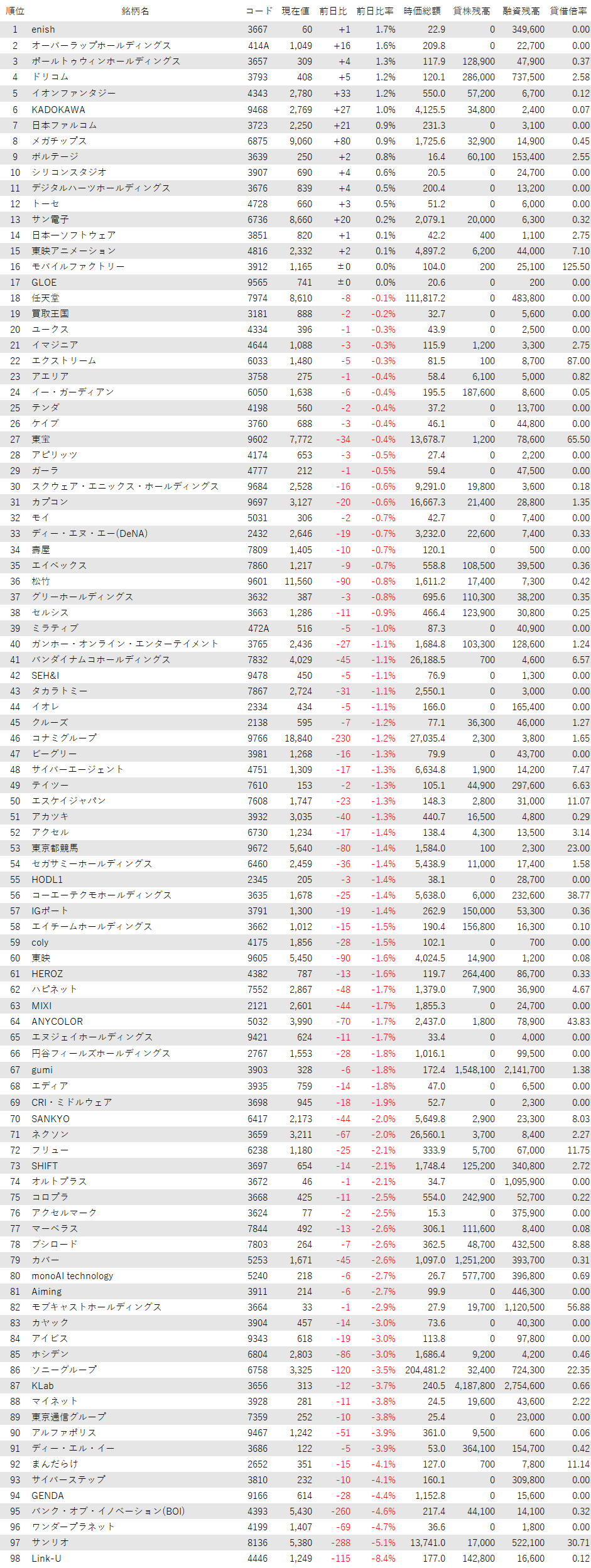 こうしたなか、ゲーム・エンタメ関連企業をみると、登録されている98銘柄のうち、上昇は15銘柄(15%)、下落は81銘柄(83%)、変わらずは2銘柄(2%)で、売り優勢だった。