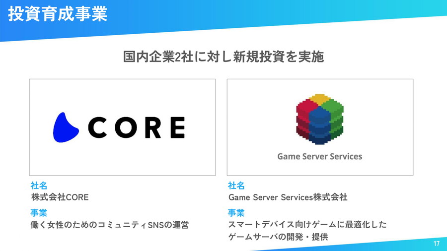 投資育成事業では営業投資有価証券残高が87億円。国内2社への新規投資を実施したほか、韓国法人コロプラネクストコリアがK-Growthの「K-コンテンツ・メディア戦略ファンド2号」に選定。SM Culture Partnersと共同でファンドを組成する予定だ。東アジアでの投資展開を加速させる。