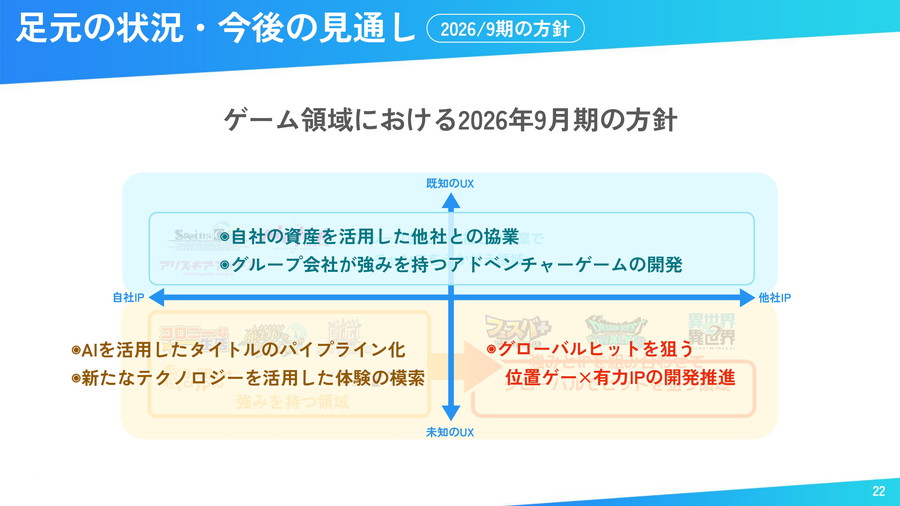 同社は中期経営方針で「Global Top 20」を掲げ、売上高1000億円、営業利益500億円を目標としている。2026年9月期は、グローバルヒットを狙う位置情報ゲームと有力IPの掛け合わせを中心に展開する。