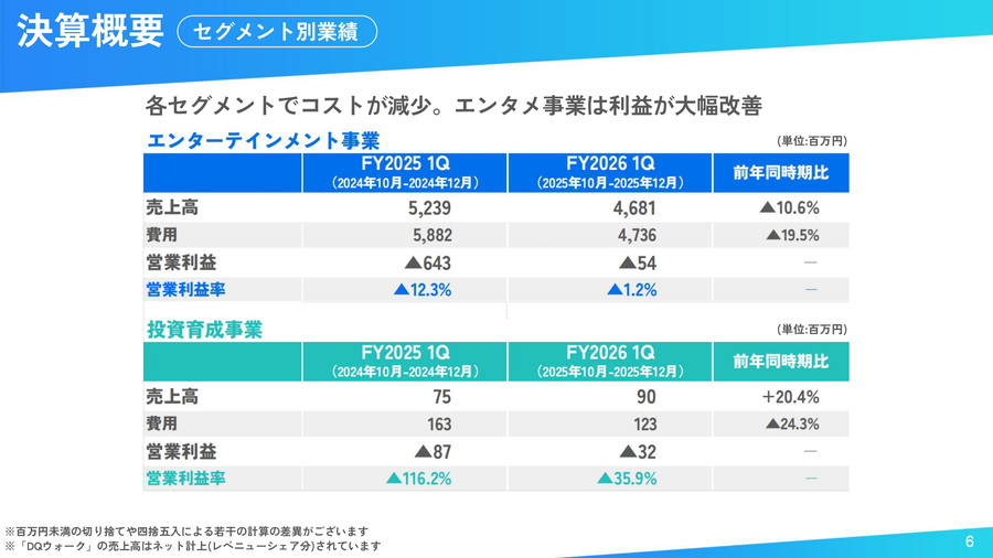 セグメント別では、主力のエンターテインメント事業は、新作タイトルのリリースがなく、既存タイトル中心の運営となったことで減収となったものの、広告宣伝費などの抑制により赤字幅は縮小した。投資育成事業は前年同期並みだった。