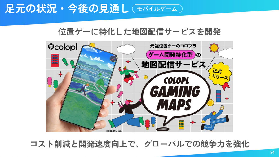 モバイルゲームのパイプラインは5本で、AI活用タイトルが1本増加。自社開発の地図配信基盤「COLOPL Gaming Maps」を導入し、"位置ゲー"特化型の地図サービスを内製化した。20年以上の運営知見を活かし、コスト削減や開発スピード向上、柔軟な仕様対応を実現するという。