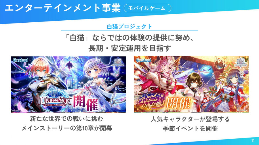エンターテインメント事業では、主力タイトルでは、『白猫プロジェクト』がメインストーリー更新や季節イベントを実施し、長期運営体制を強化。売上は逓減傾向にあるものの、コラボやゲームバランス調整などを通じてユーザー満足度を重視し、安定運用を目指している。