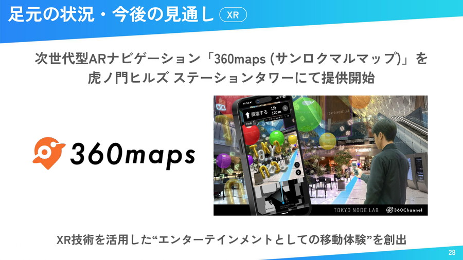 XR分野では、次世代型ARナビ「360maps」を虎ノ門ヒルズ内のTOKYO NODEおよびステーションタワーに導入。商業施設での高精度ナビとエンターテインメント体験の融合を図る。
