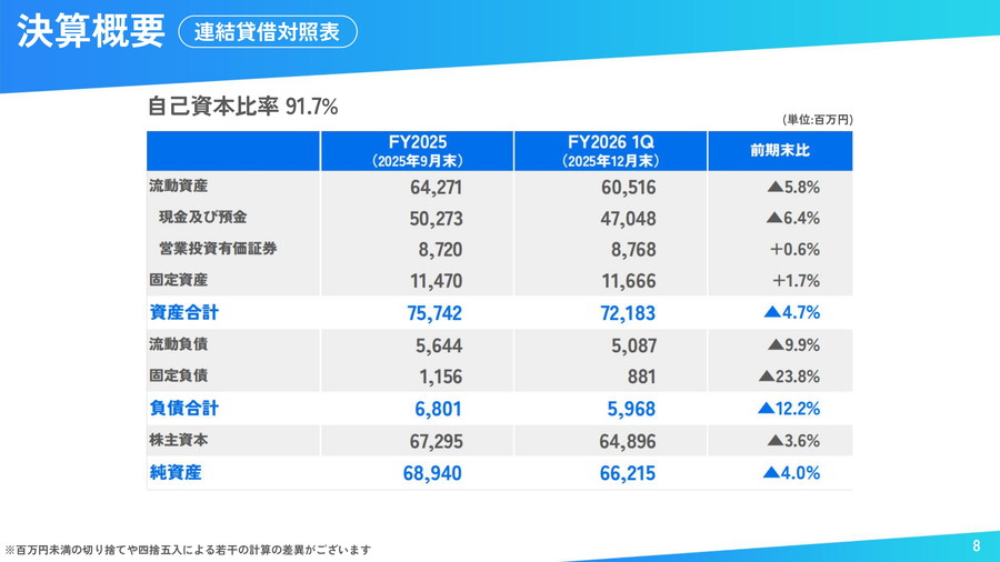 貸借対照表では、配当金支払いにより現預金は減少したものの、自己資本比率は91.7%と高水準を維持した。財務基盤の安定性は引き続き強固だ。