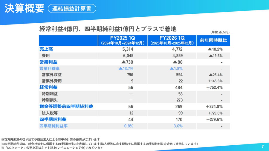 コロプラ<3668>は、2月4日、2026年9月期第1四半期の決算説明会をオンラインで開催した。連結売上高は47億円で2ケタ減収となったものの、広告宣伝費をはじめとする費用減少により、前年同期比で各利益は大幅に改善した。経常利益は為替差益4億4200万円や受取利息1億1500万円の影響もあって4億8400円、四半期純利益1億7000万円と黒字転換に成功した。