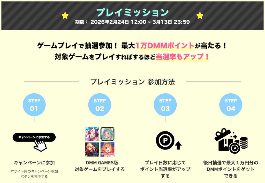 ■ゲームプレイで最大10,000DMMポイントが当たる!?プレイミッション