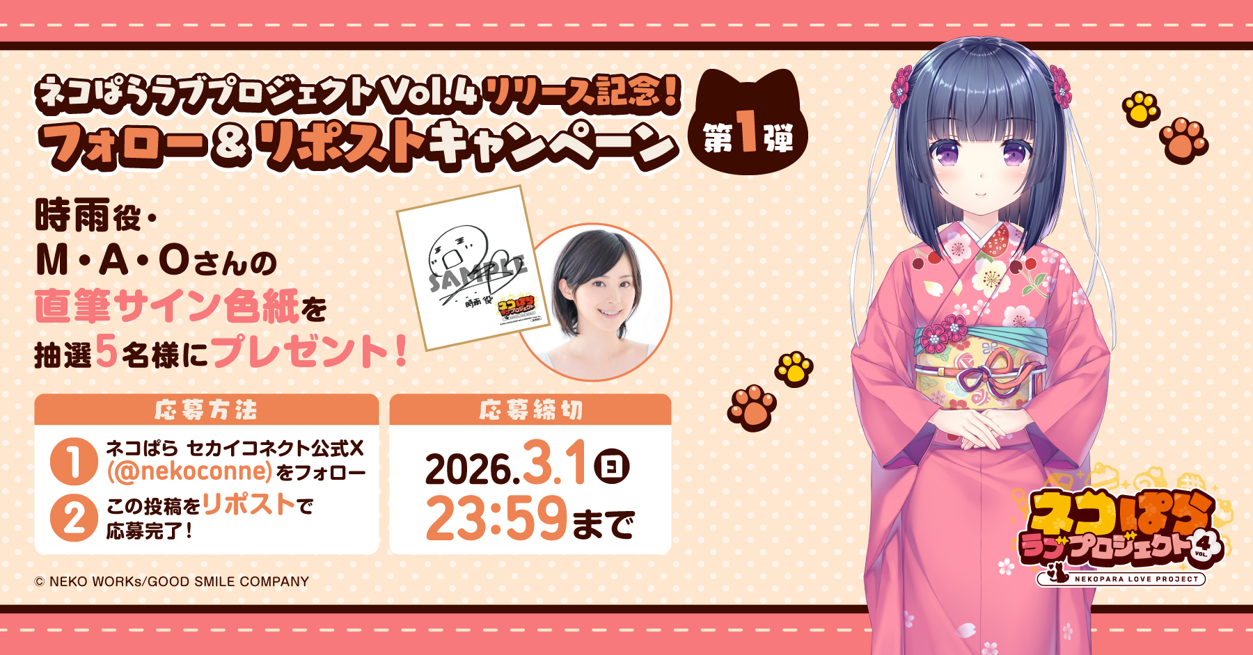 『ネコぱら ラブプロジェクトVol.4』のリリースを記念して、時雨役のM・A・Oさん、フレーズ役の山本希望さんの直筆サイン色紙が当たるキャンペーンを『ネコぱら セカイコネクト』公式Xにて2週連続で開催する 。
