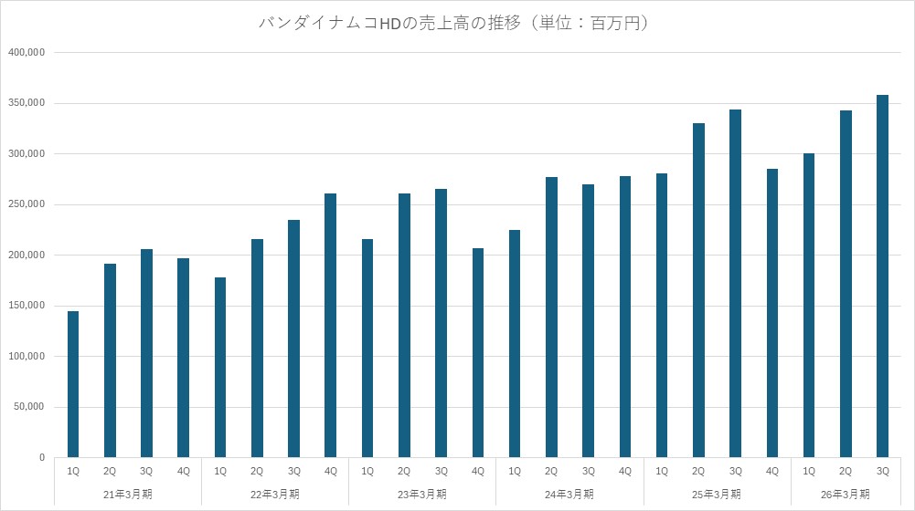 ・概況: 第3四半期として初めて売上高1兆円を突破した。トイホビー事業では『ガンダムシリーズ』(ガンプラ、カードゲームなど)の拡大に加え、『DRAGON BALL』『ONE PIECE』が高水準を維持し、『たまごっち』関連商品(『Tamagotchi Paradise』等)も人気を集めた。デジタル事業(ゲーム)では、新作の『ELDEN RING NIGHTREIGN』や『たまごっちのプチプチおみせっち おまちど~さま!』『デジモンストーリー タイムストレンジャー』が好調だったものの、前年同期とのタイトル編成の違いにより減益となった。一方、ネットワークコンテンツでは新作『SDガンダム ジージェネレーション エターナル』が好調に推移している。映像音楽事業では新作『機動戦士Gundam GQuuuuuuX』が新たなファン層を獲得し、グループ全体に波及効果をもたらした。