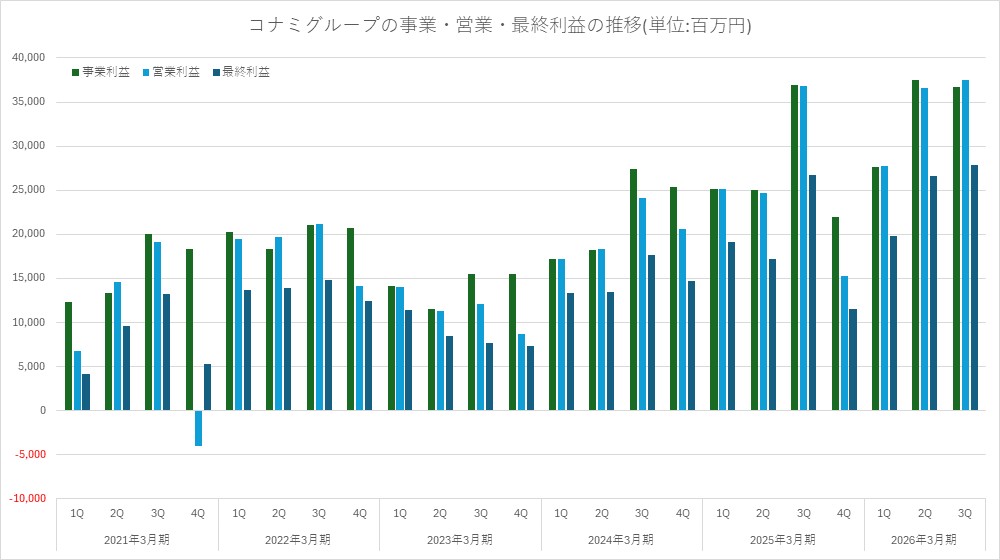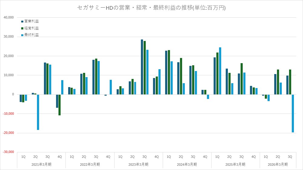 ・概況: エンタテインメントコンテンツ事業において、買収したRovio社(主力IP『アングリーバード』)ののれん等の減損損失を計上し、大幅な最終赤字に転落した。コンシューマ分野では新作『Football Manager26』や『ソニックランブル』を投入したものの想定を下回った。今後は新作『龍が如く 極3/ 龍が如く3外伝 Dark Ties』や『プロサッカークラブをつくろう!2026』の展開に注力する。一方、遊技機事業は減益だが、パチスロ『スマスロ 化物語』、パチンコ『e 北斗の拳11暴凶星』等が計画を上回っており通期では大幅な増益となる見通し。第4四半期には『スマスロ 北斗の拳 転生の章2』等の主力タイトルを投入するとのこと。