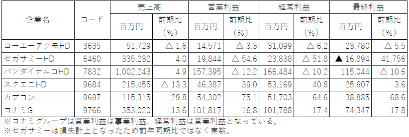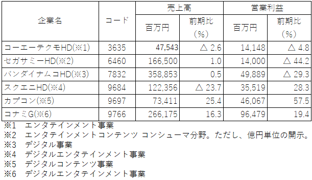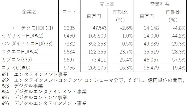家庭用ゲームソフト大手6社の決算が出揃った。本業の儲けを示す営業利益が増益だったのは3社だった。カプコン<9697>とスクウェア・エニックス・ホールディングス<9684>、コナミグループ<9766>が増益となった一方、コーエーテクモホールディングス<3635>、セガサミーホールディングス<6460>、バンダイナムコホールディングス<7832>が減益となった。ゲーム事業にフォーカスしても同様の状況だった。