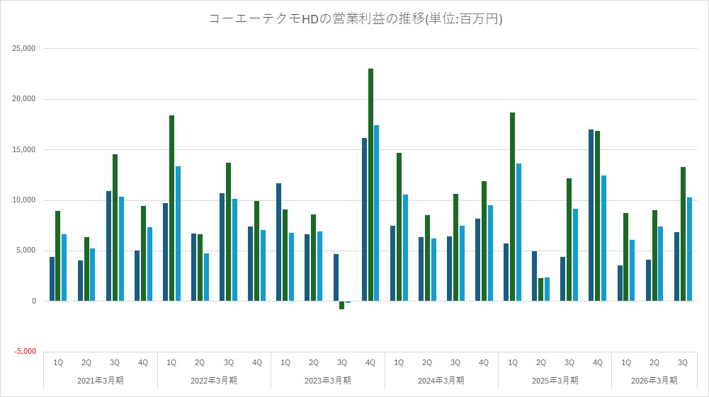 ・概況: オンライン・モバイル分野の既存タイトル減少により第3四半期累計では減収減益となった。オンライン・モバイル分野が既存タイトルの反動減により減収となったことや人件費などの先行投資が響いた。しかし、第3四半期単独で見ると、コンソール・PCで大型新作『真・三國無双 ORIGINS』や『ゼルダ無双 封印戦記』(累計出荷100万本突破)を発売し、業績は前年同期を大幅に上回った。また、パッケージゲームでは『三國志8REMAKE with パワーアップキット』『Winning Post102026』を発売予定。モバイル・オンライン分野では、新作『キングダム 覇道』の配信を開始した。第4四半期には『仁王3』をはじめとした複数タイトルの発売を予定している。