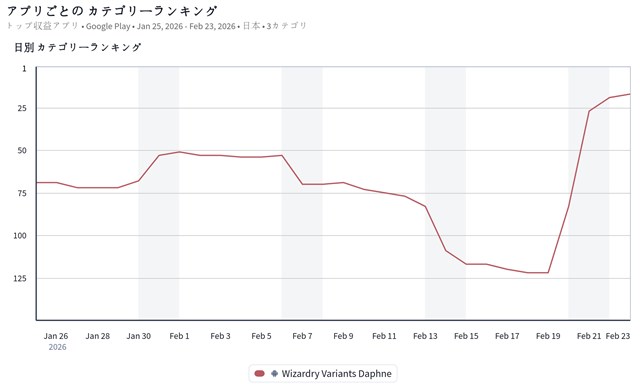 また、ドリコム<3793>の『Wizardry Variants Daphne(ウィザードリィ ヴァリアンツ ダフネ)』が17位とトップ20圏内に急上昇した。『ウィズダフネ』は、2月19日より、ダークファンタジー「ブレイド&バスタード」とのコラボイベントを復刻開催していることなどが足元の順位上昇につながっているもようだ。