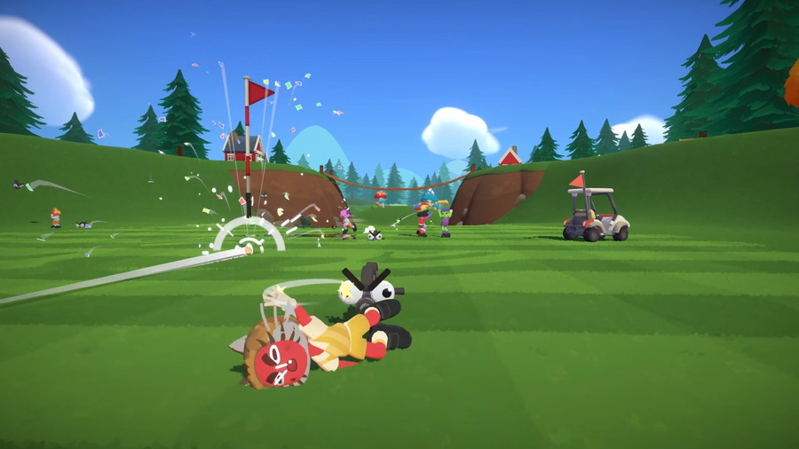 本作は、リアルタイム進行のはちゃめちゃなオンラインマルチプレイゴルフ。最大8人のプレイヤーが同時にボールを打ち、ロケットランチャーやゴルフカートといった妨害手段を駆使しながら、最速カップインを目指す。打順待ちは一切なく、ライバルからの攻撃を避けつつ、パワーアップアイテムや地雷が仕掛けられたコースを駆け抜ける、カオスなゴルフ体験が特徴だ。