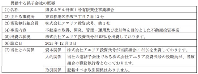 アエリア<3758>は、2月24日、連結子会社アエリア投資弐号が有限責任事業組合を設立し、当該組合への出資を行ったことにより、当該組合がアエリアの孫会社に該当することになったことを発表した。