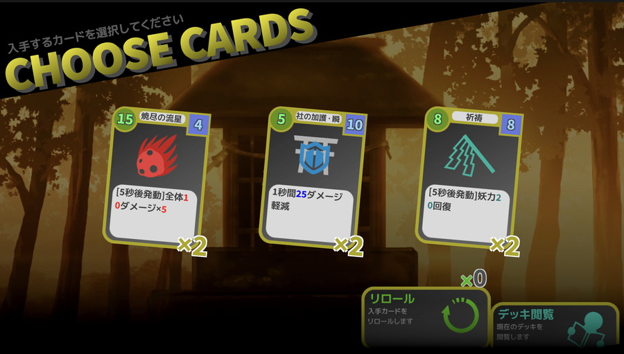 戦闘では、いわゆる「マナ」にあたる妖力が時間経過で回復し、ターン制の概念がない。攻撃バフで大ダメージを狙う、防御カードで敵の攻撃予告を完封する、毒でじわじわと攻めるなど、すべてはプレイヤーの構築するデッキ次第となる。