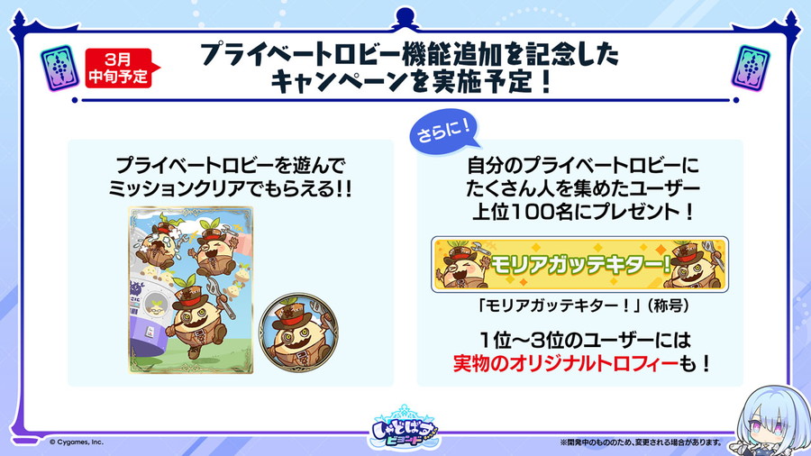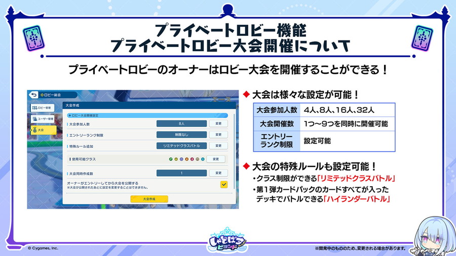 3月中旬ごろ、「シャドバパーク」でオリジナルのロビーを作ることができるプライベートロビー機能を追加する。1人1つまでロビー作成が可能で、最大 300人まで入ることができるほか、パスワード設定も可能だ。ロビー全体にバトルのオリジナルルールを設定できる「カスタムルール設定」機能も搭載する。
