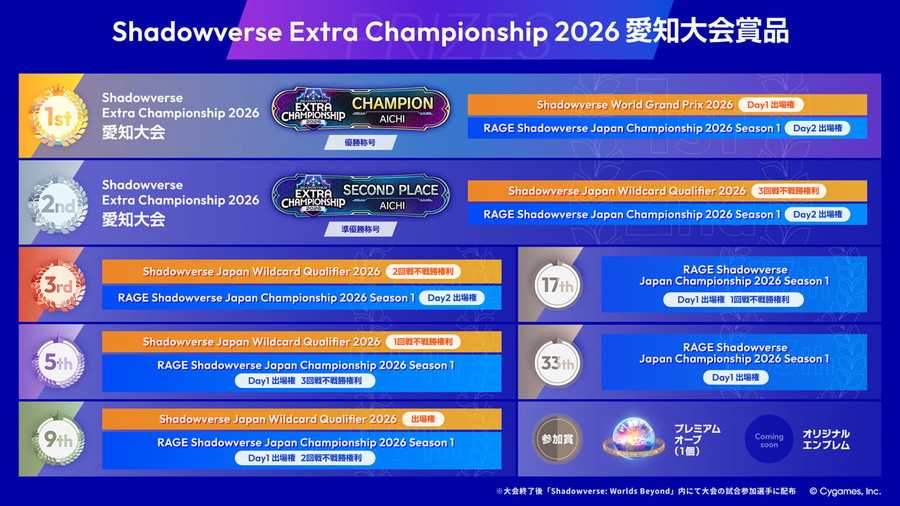3月15日に開催。「Shadowverse World Grand Prix 2026」 Day 1 への出場権がかかるオフライン公式大会だ。チケットは 3月8日まで先着順で販売中である。