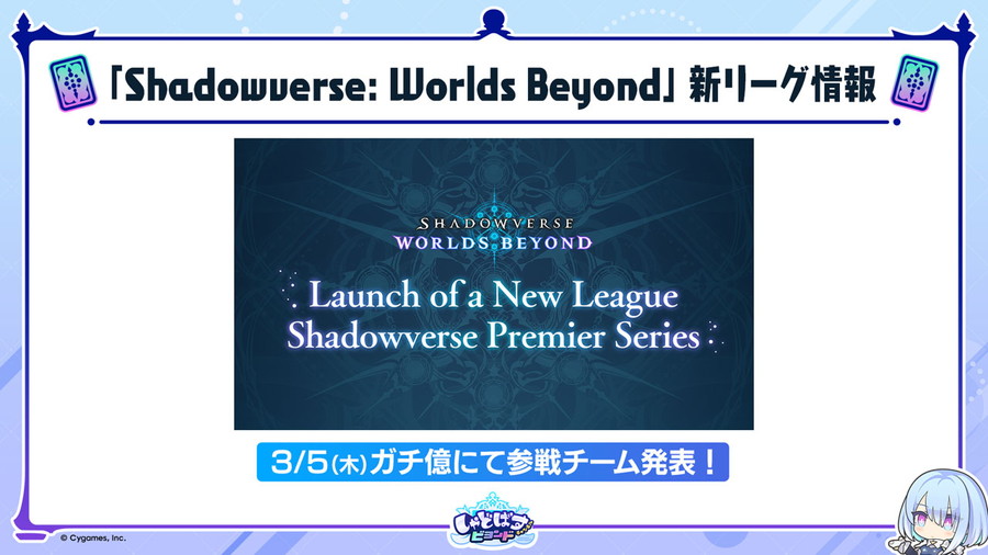 「Shadowverse: Worlds Beyond」の新たなプロジェクトとして、Cygames主催の新リーグが発足する。7月の開幕を予定しており、開幕に先立ち、3月5日放送の「『ガチで1億とりにいく TV』Season2」にて参戦チームを発表する。同日 3月5日に選手公募を開始する。