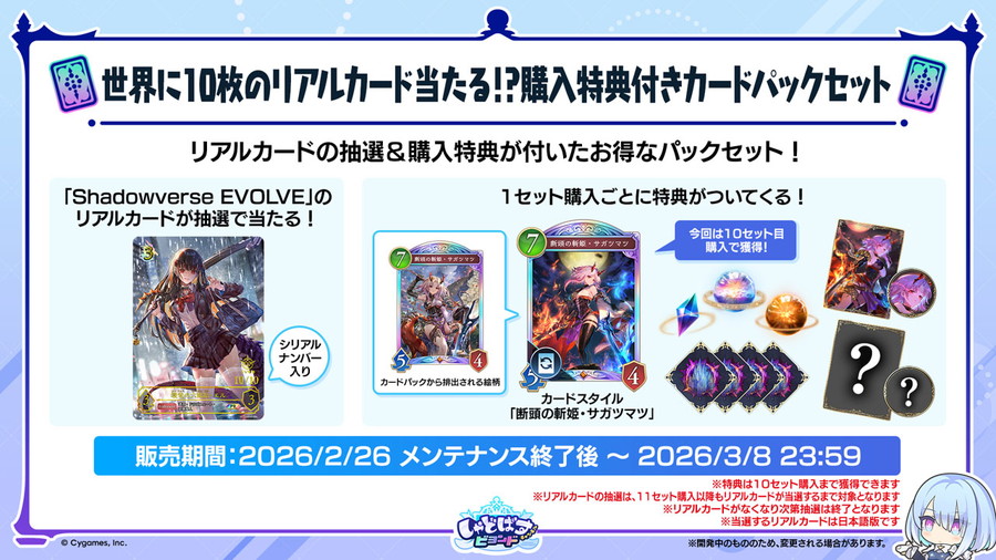 『Apocalypse Pact / アポカリプス・パクト』のリリースを記念して、「世界に 10 枚のリアルカードが当たる!?購入特典付きカードパックセット」を販売する。購入者は、世界に限定 10 枚の「壊竜の六銘伝・エル」の「Shadowverse EVOLVE PR カード」が抽選で獲得できる。