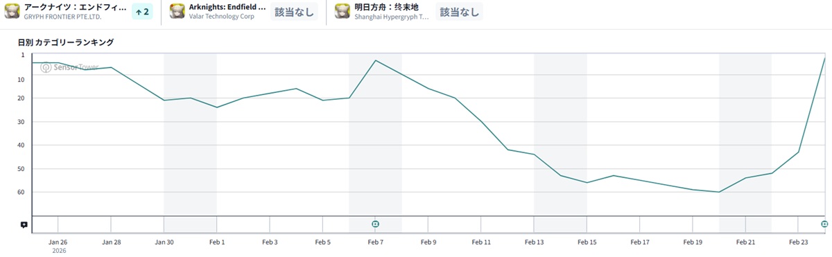 また、GRYPHLINEの『アークナイツ:エンドフィールド』が43位からトップ3に入った。