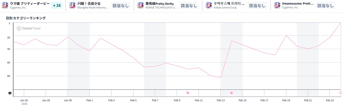 2月25日9時半現在のApp Storeセールスランキング(ゲームカテゴリー)は、Cygamesの『ウマ娘 プリティーダービー』が首位を獲得した。