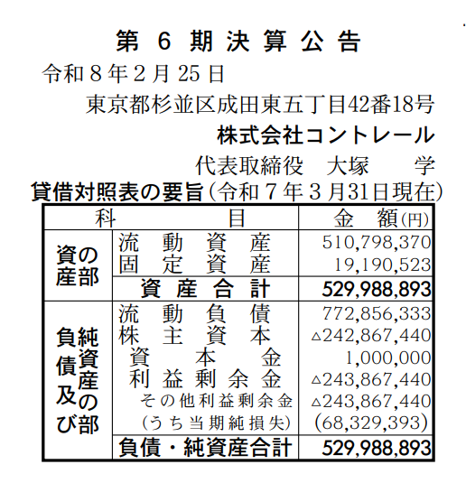 他方、コントレールは、MAPPAのグループ会社で、『この世界の片隅に』で知られる片渕須直監督の新作長編映画を制作することを目的に2019年に設立された(関連記事)。25年3月期(第6期)の決算は、最終損失6800万円で債務超過となっていた。