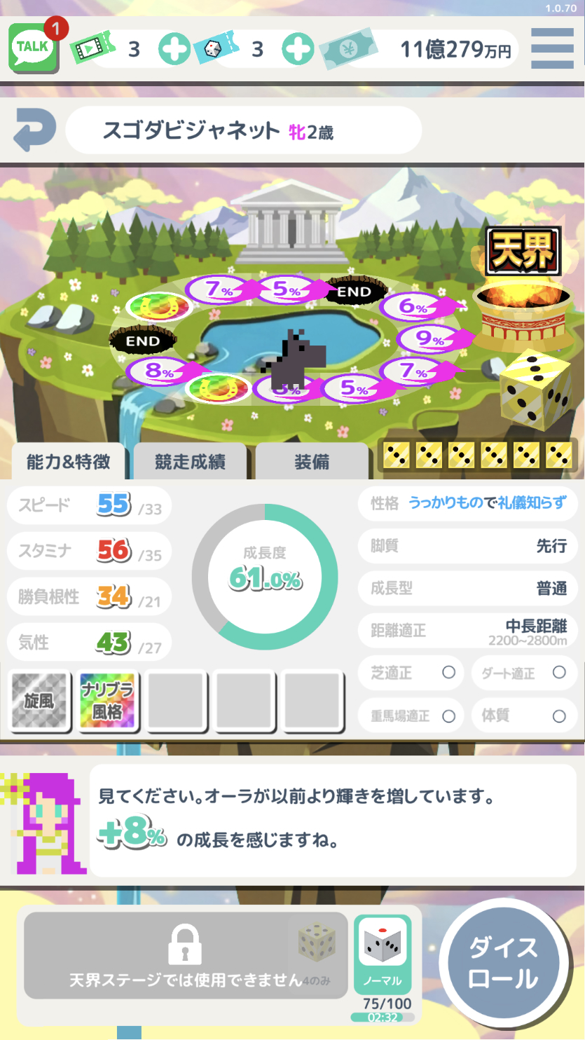 6回連続で同じ出目を出すとボーナスステージ「天界」へ突入。天界は落とし穴に落ちない限り有益なマスを周回し続けられるループマップで、通常の育成では到達し得ない能力強化のチャンスが広がる。さらに出目が7回以上続けば「ストック」を獲得でき、落とし穴に落ちた際にも天界へ復帰可能。その際、女神が落とし穴を1つ消してくれることも。